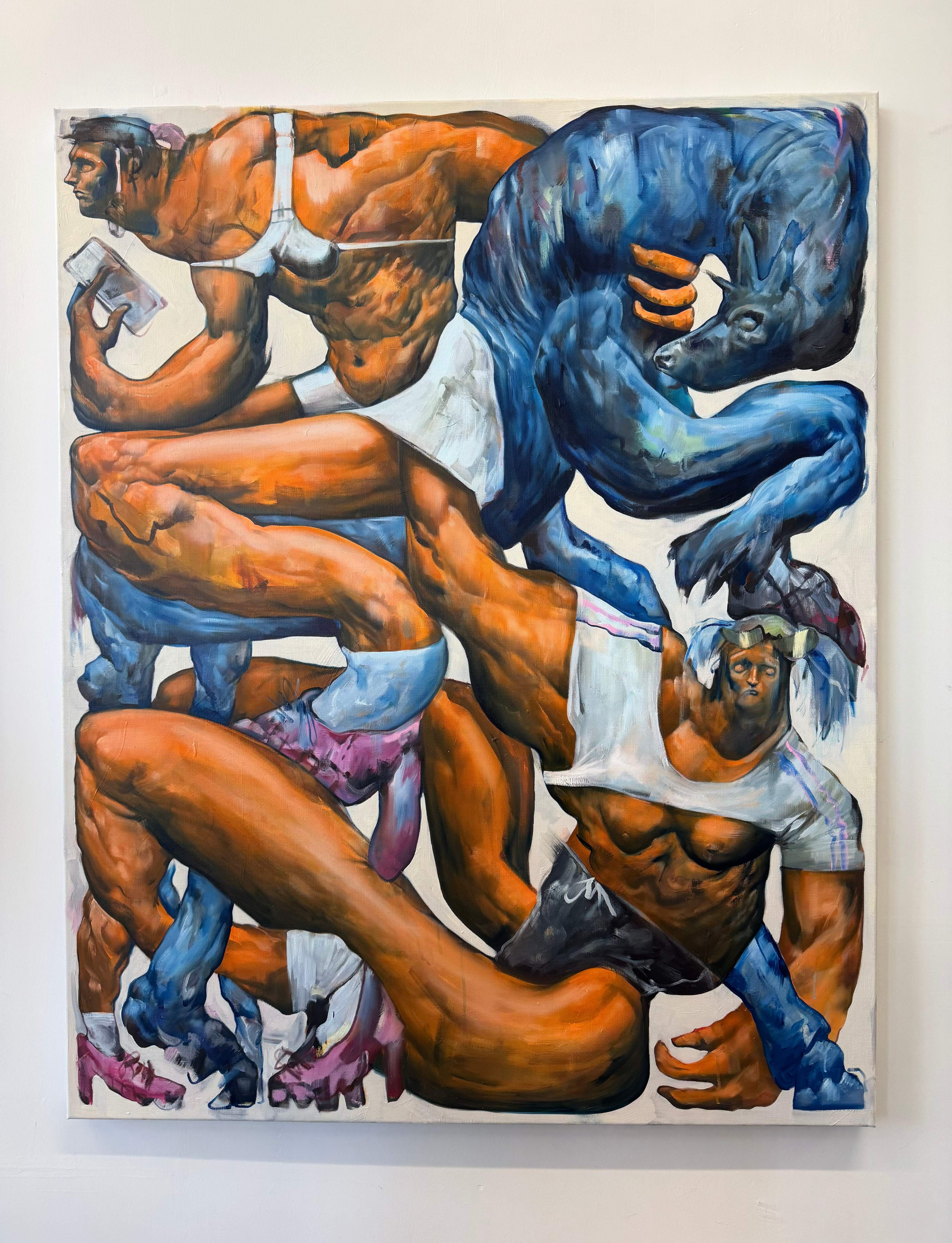 Danish artist Laust Højgaard explores the tension between strength, vulnerability, and identity through paintings and sculptures populated by symbolic characters and surreal situations. Drawing inspiration from classical mythology, architecture, and contemporary pop culture, his work investigates how individuals navigate societal structures while negotiating their own instincts and inner conflicts. Based on the small island of Thurø near Svendborg in southern Denmark, Højgaard works across painting and sculpture, often combining expressive figuration with raw, intuitive processes. His work frequently reflects on humanity’s relationship with nature, control, and the systems that shape modern life.
