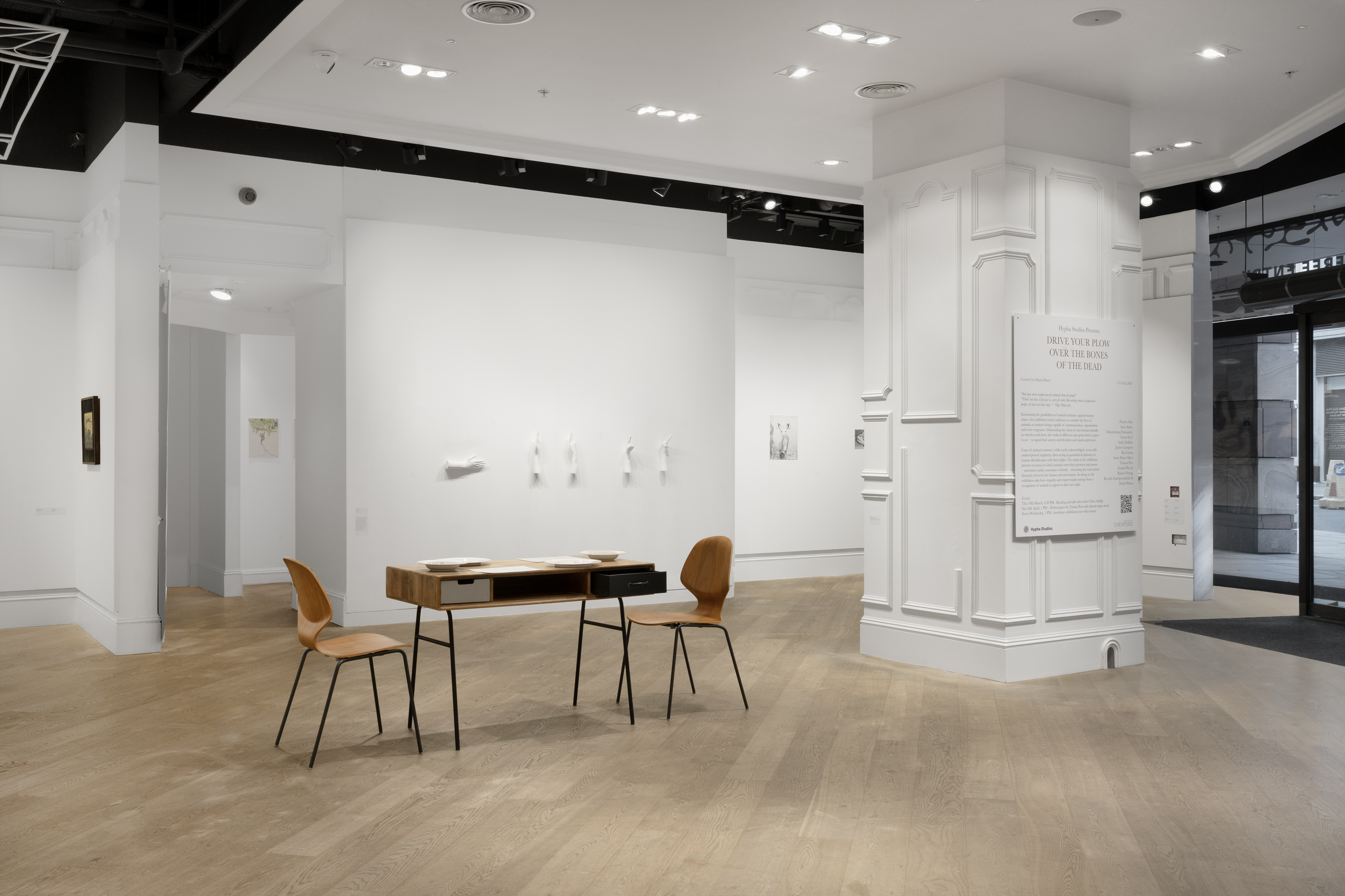 The title of the exhibition references Drive Your Plow Over the Bones of the Dead, the environmentalist and feminist eco-thriller by Olga Tokarczuk, who in turn draws this title from William Blake’s Proverbs of Hell. The story is narrated by Janina Duszejko, an ageing former engineer, amateur translator of Blake, and passionate animal rights advocate, whose outcry against hunting is consistently met with bewilderment and contempt. Local authorities and neighbours attribute her pleas to eccentricity, old age, as well as a “women’s instinct for caring.”