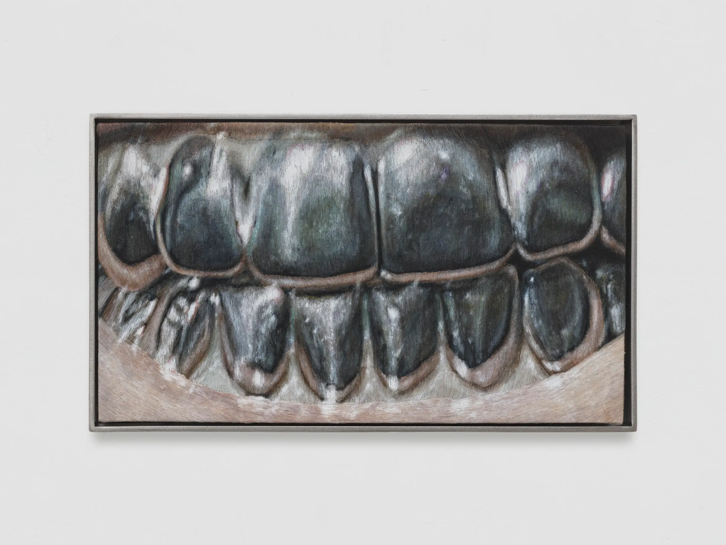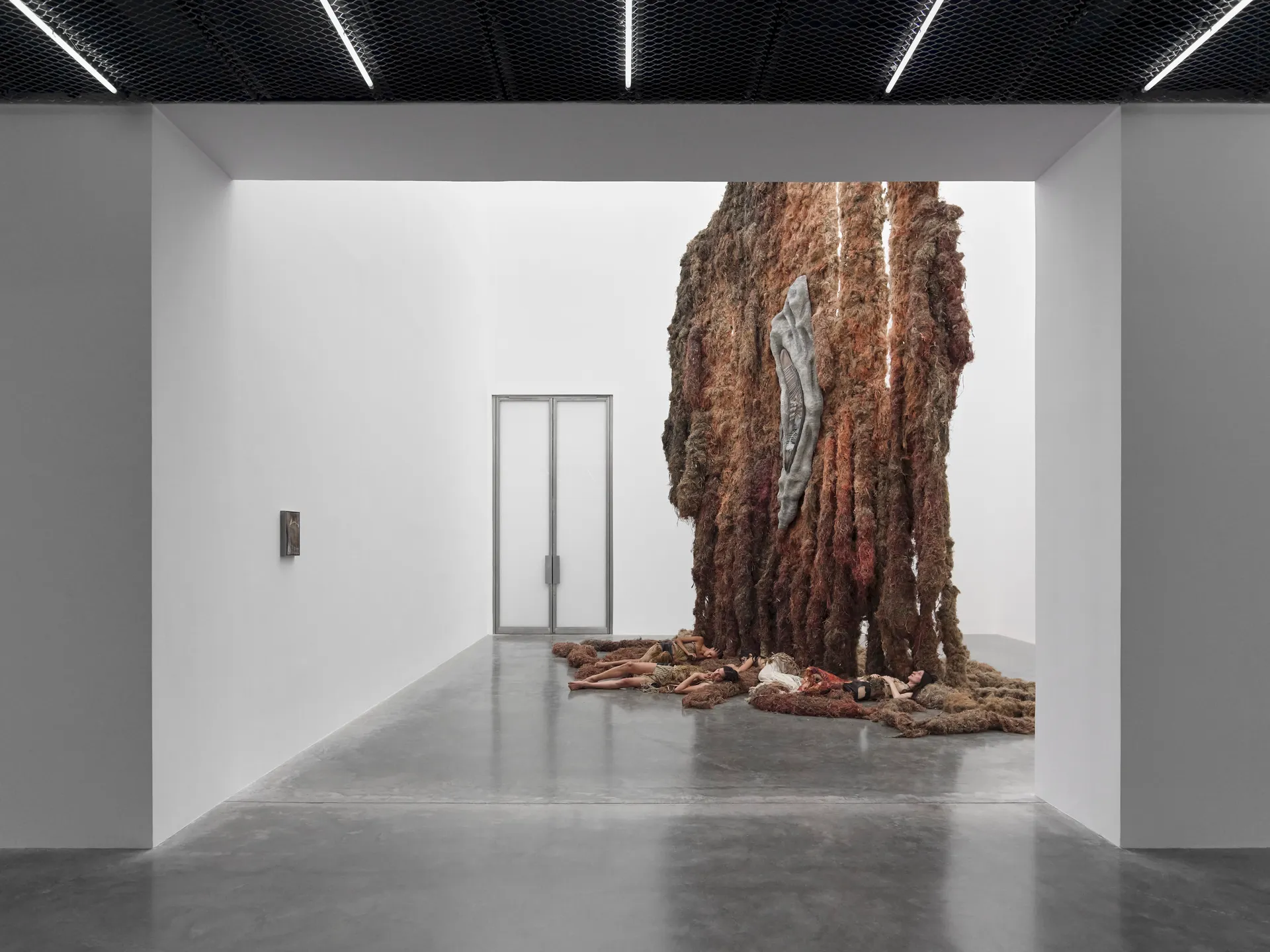 By engaging an uncontrollable biological process as a medium, the artist considers living matter as durational performance. Around and across the platform stainless steel poles have been positioned, each affixed with a steel-framed embroidery. Though the artist was first drawn to hand-embroidering for an immersive, processual quality that allowed her to escape ‘calculating time’, the result is inexorably its own temporal measure, one marked strand by strand. Speaking to this, Writing on the Back I and Lost Message (both 2025) depict hands engaged in acts of mark-making; in one, a ‘lost message’ is written with a piece of charcoal, while in another charcoal dust and grease are directly applied with fingertips. Works such as these posit another early technology, that of drawing as a mnemonic aid and system of historical record, while elsewhere, the abstract Shared Fire (2025) extends these ideas to that of a collective inheritance of the future. At the perimeters of the installation, the immense, wall-mounted reliefs stand guard. Tinted with stone and mineral dust, these sculptures reminisce mottled relics or bodily remains, their unsettling biomorphic alterity conjuring the fossilised fragments of a large, unidentified creature. All around, a glitching sound composition created with Billy Bultheel rings out and into the space, further immersing visitors in Hosnedlová’s archaeo-futuristic vision of this alternative world.