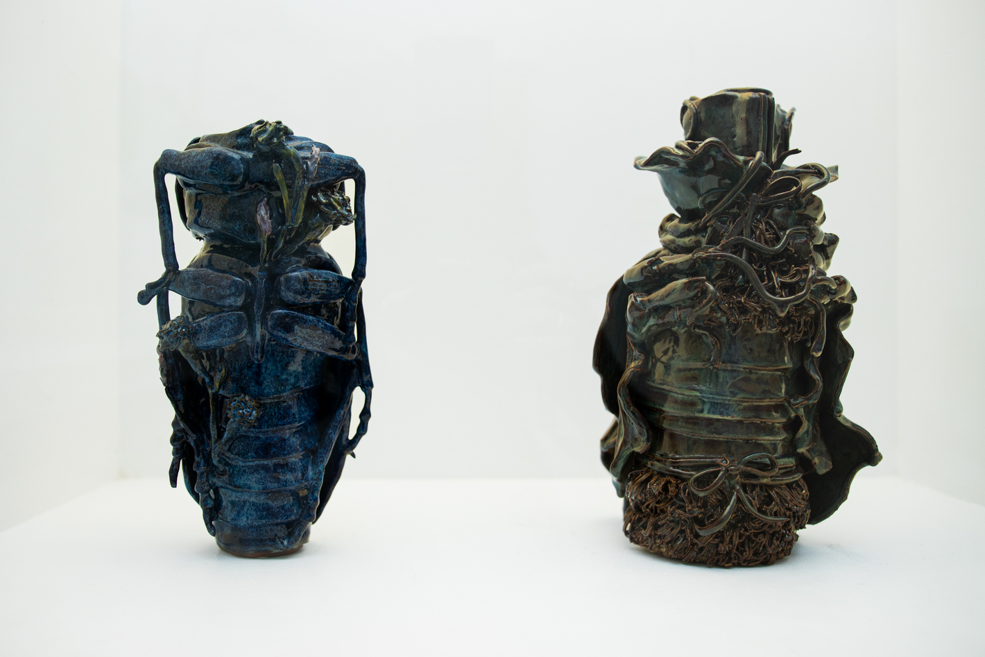 Upon entering the gallery, awindow-cased display introduces sculptures by Abigail Norris, Cas Campbell, and Meitao Qu, evoking a baroque, archival cabinet-of-curiosities aesthetic. Campbell’s and Qu’s meticulously crafted stoneware, alongside Norris’s living,organism-like objects, are presented as social relics—material traces ofhumanity suspended between care, decay, and classification.