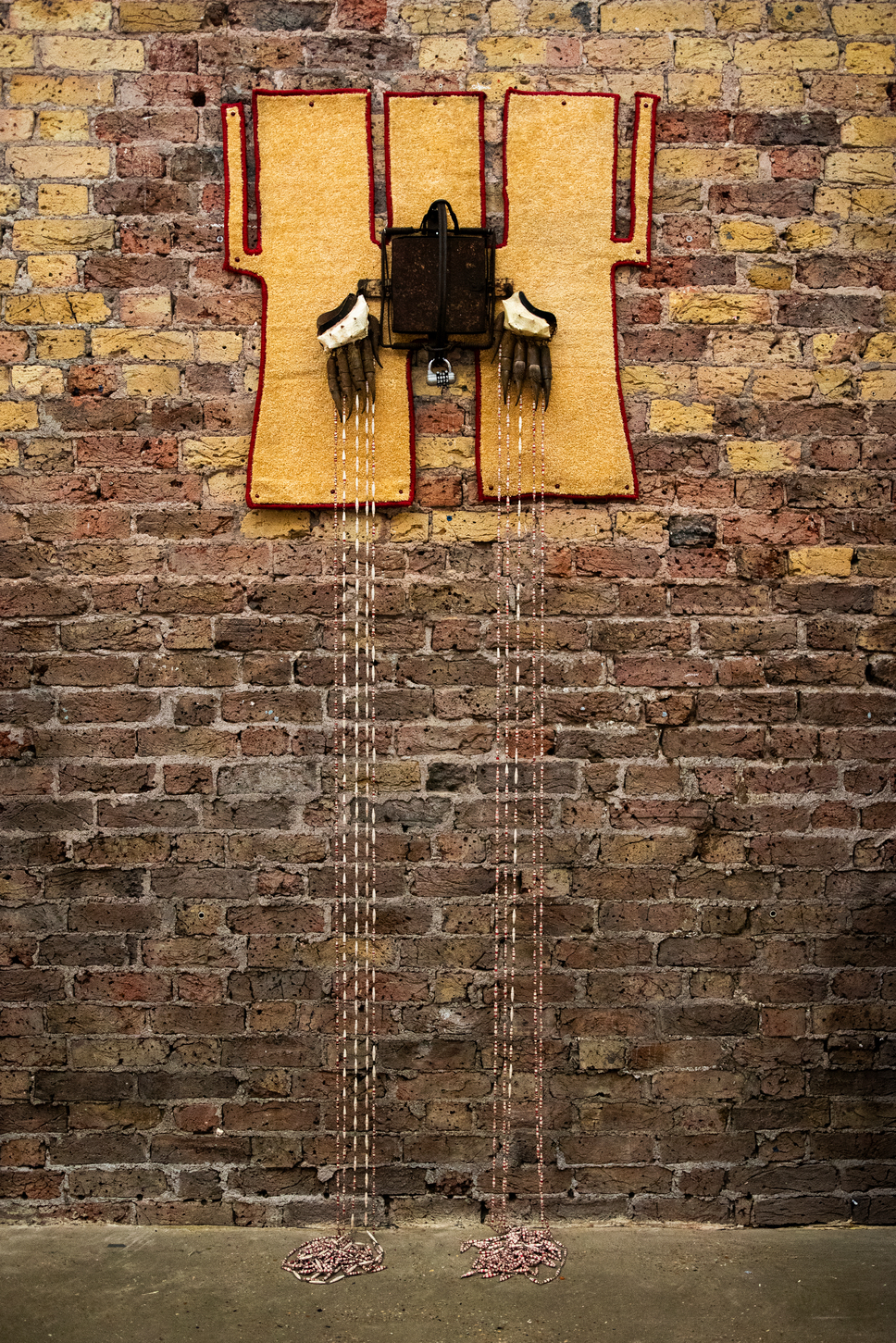 Speaking of hair, it is difficult to miss Irene Pouliassi’s celestial taxidermy, which anchors the space with amythic threshold figure assembled from found objects, bones, garments, and industrial materials. Neither human nor animal, the work resists fixed identity, speaking to societal violence and bodily vulnerability. It entersinto a precise dialogue with Juntao Gao’s Phantom Limb No. 1, where animal traps, carpets, curtains, and industrial hardware introduce a latent violence and a sense of bodily absence.